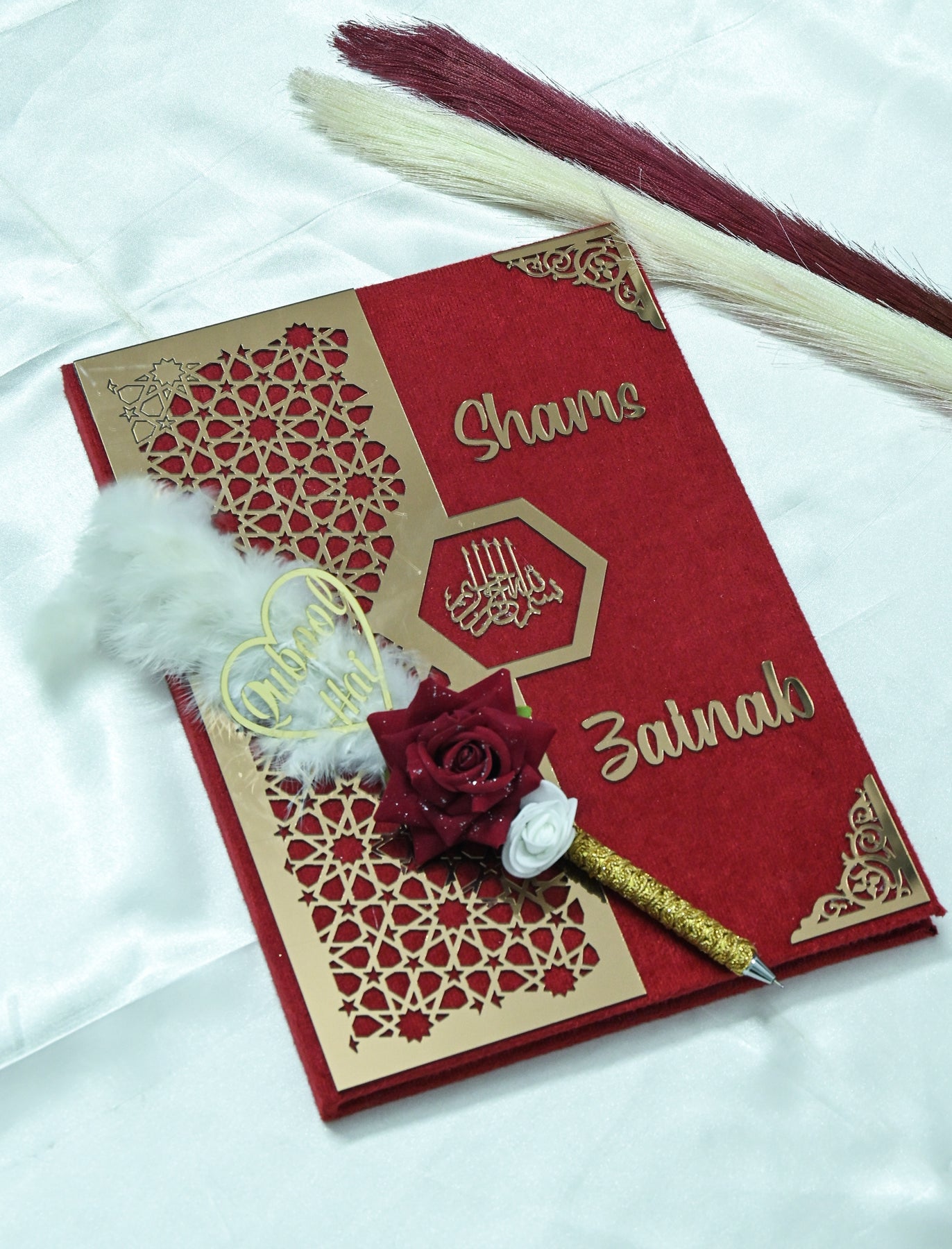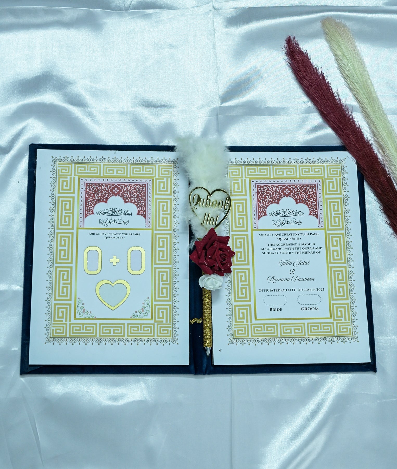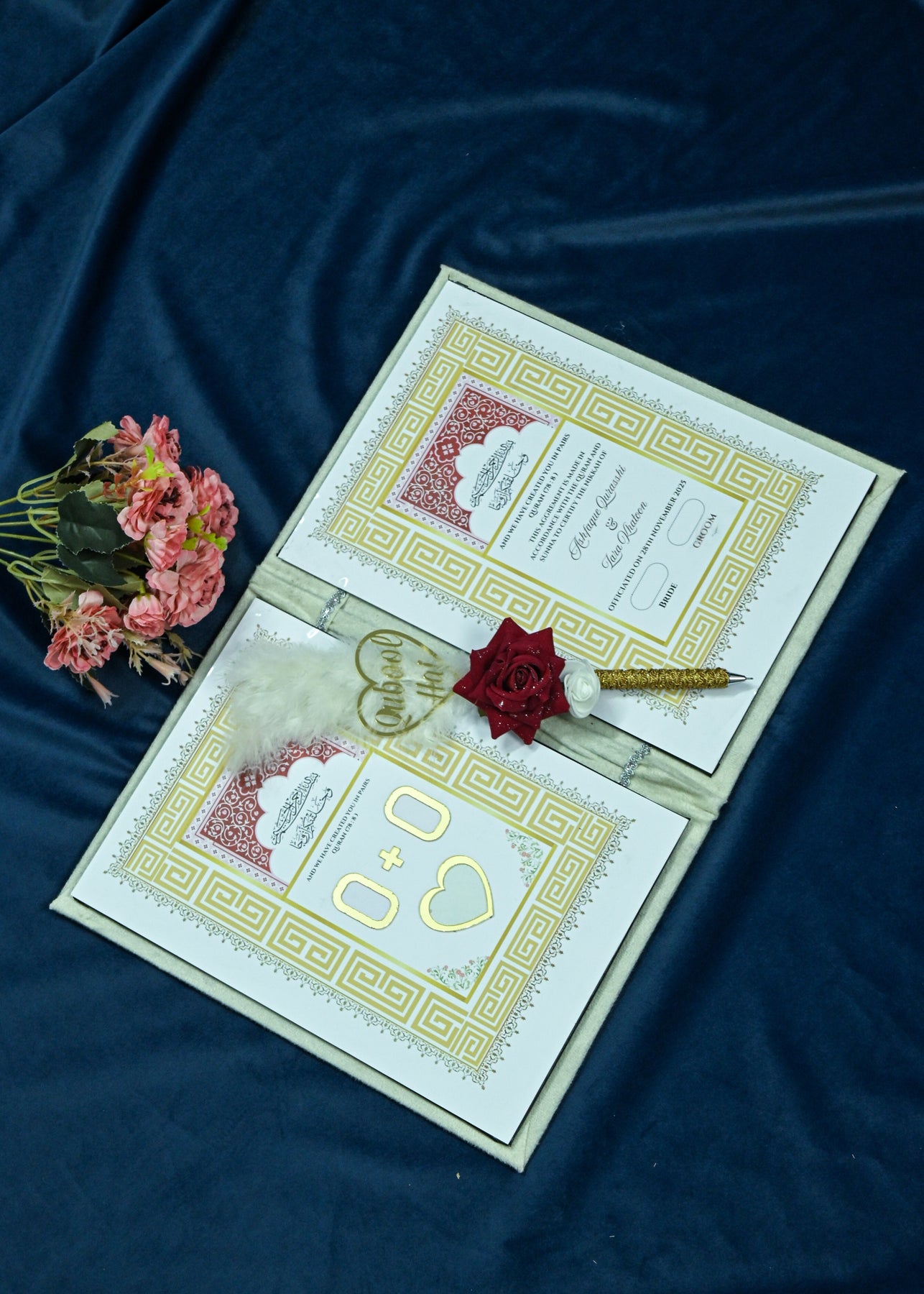 If you wish to elevate the emotional experience of your ceremony, the Customised Star Design Nikah Nama Gift option includes a beautifully designed Qubool Hai pen. This pen is symbolic of acceptance, unity, and the sacred vows exchanged during the Nikah. It adds meaning, beauty, and a personal touch to an already special moment.