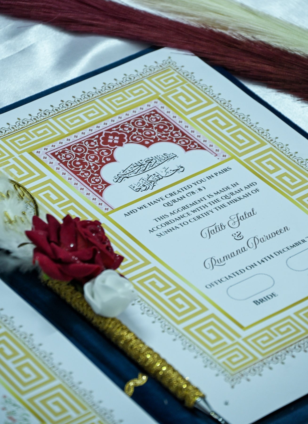 The structured layout ensures that all necessary information—Bride’s name, Groom’s name, Wali details, Witness signatures—is arranged clearly and respectfully. The combination of velvet texture and strong foam board also makes the document feel premium and luxurious in hand.