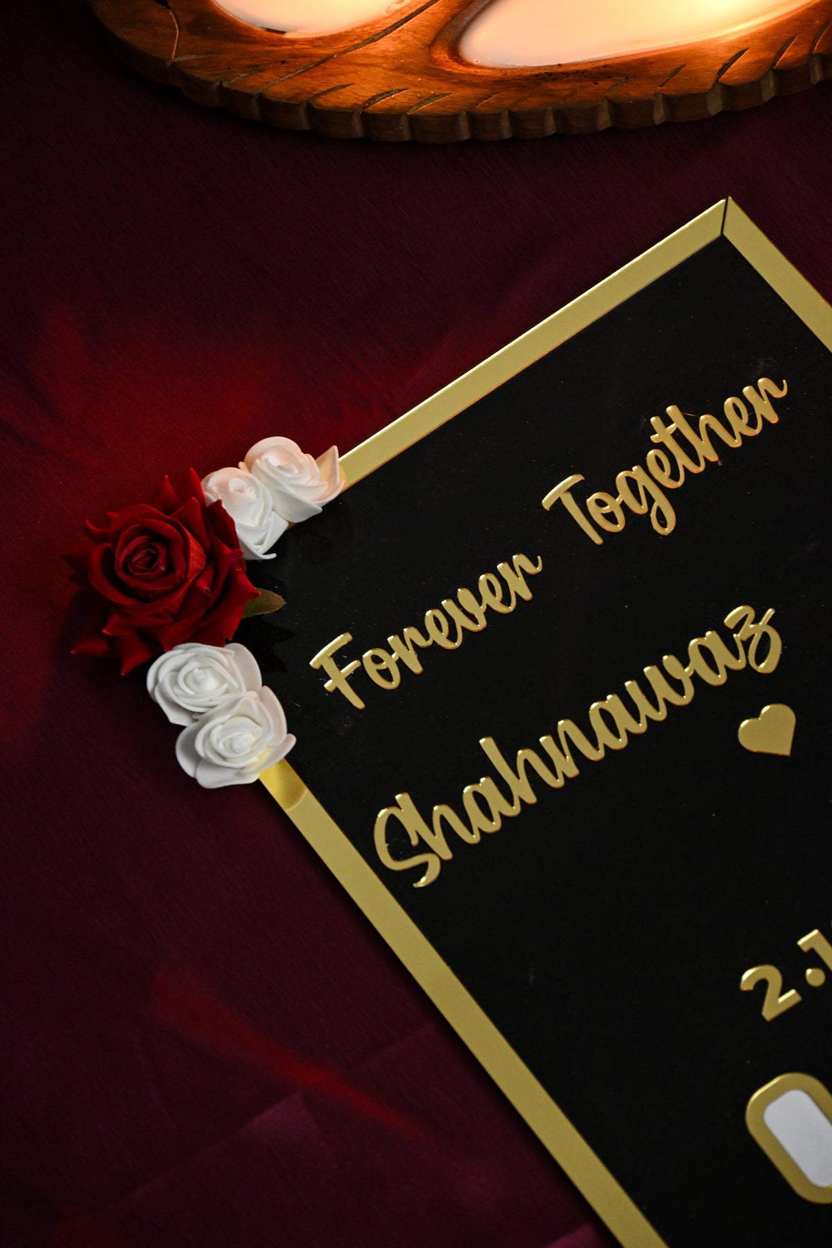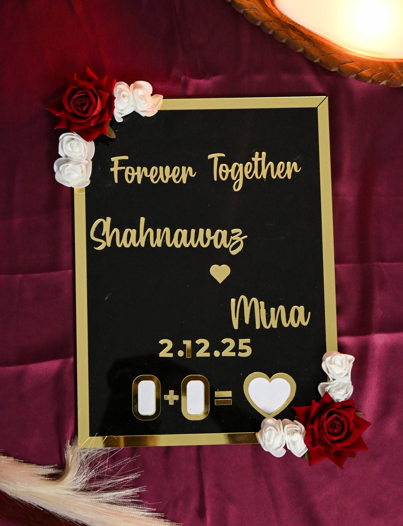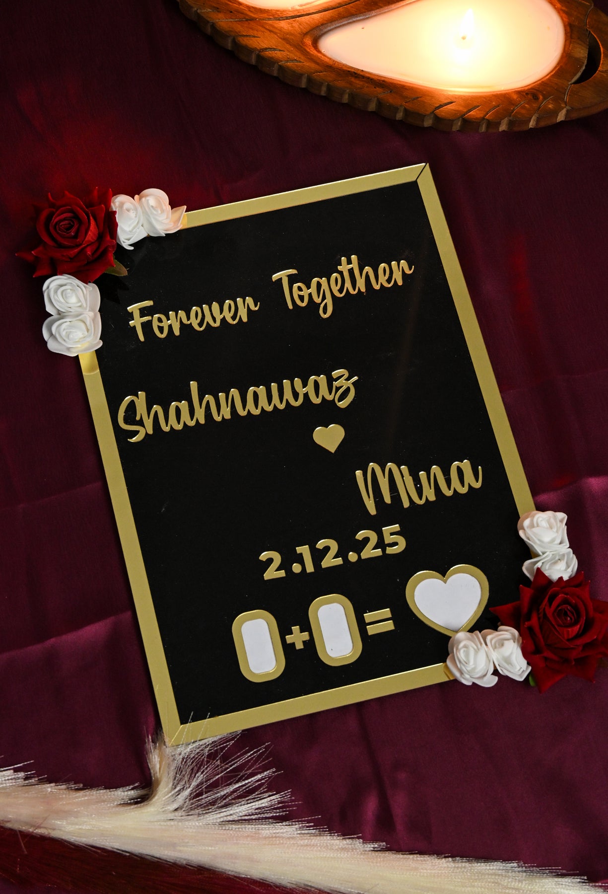 Crafted with a base of high-quality MDF, the Thumb Board offers durability and a premium feel. The surface is designed using high-grade acrylic, giving the board a sleek, glossy appearance that enhances the intricacy of the thumb impression design. Adding to its romantic aesthetic, artificial roses are delicately placed on two corners, creating a beautiful blend of texture, charm, and sophistication.